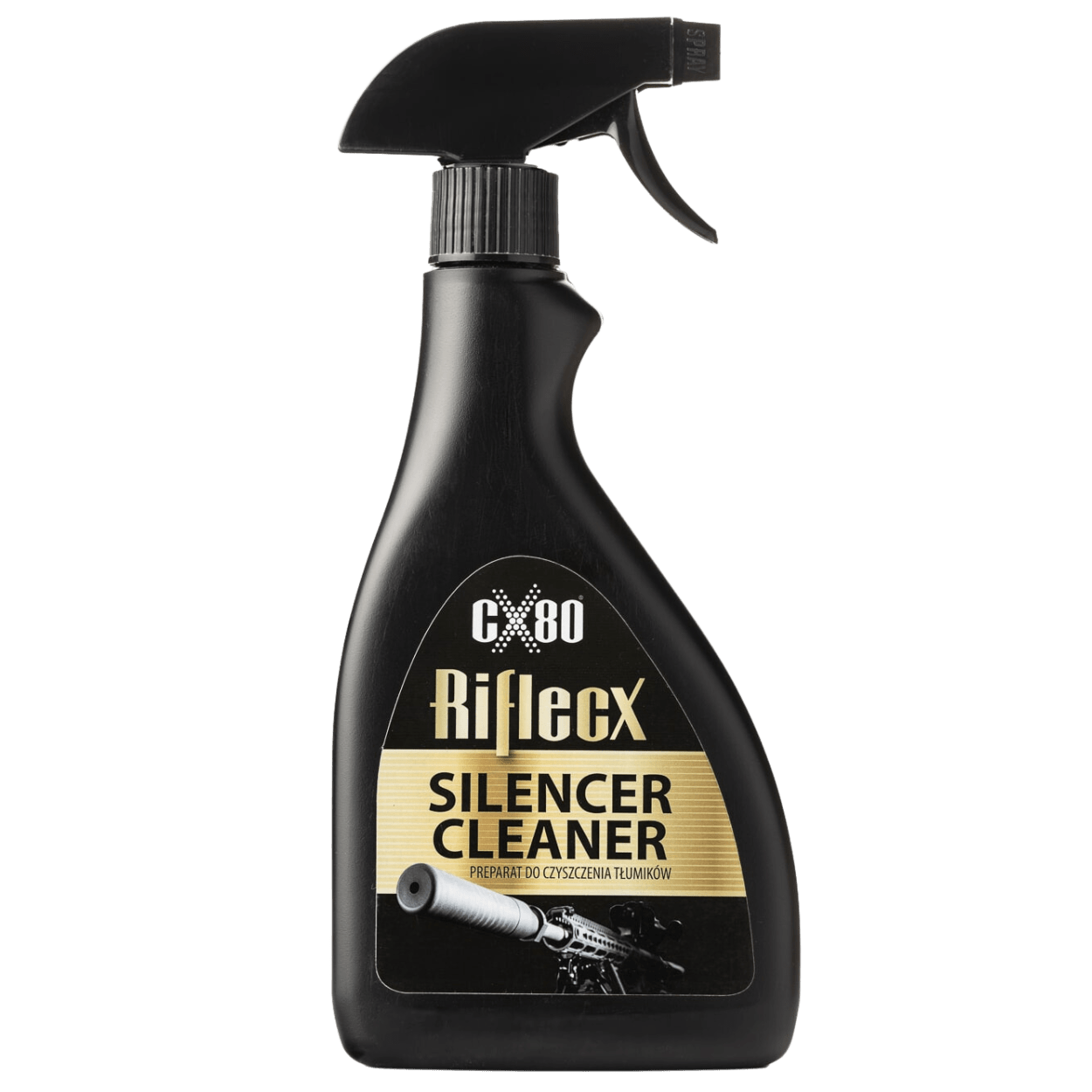 Tłumik rozłożyć na części, spryskać płynem do czyszczenia tłumików Riflecx, odczekać 10 minut, usunąć pozostałości prochu strzelniczego za pomocą miedzianej szczotki, zakonserwować tłumik płynem konserwująco naprawczym z Teflonem Riflecx.